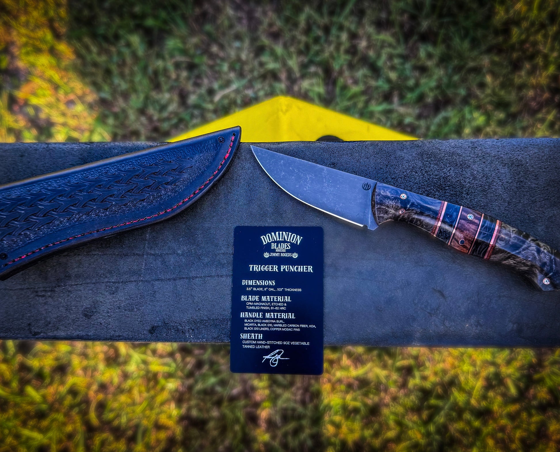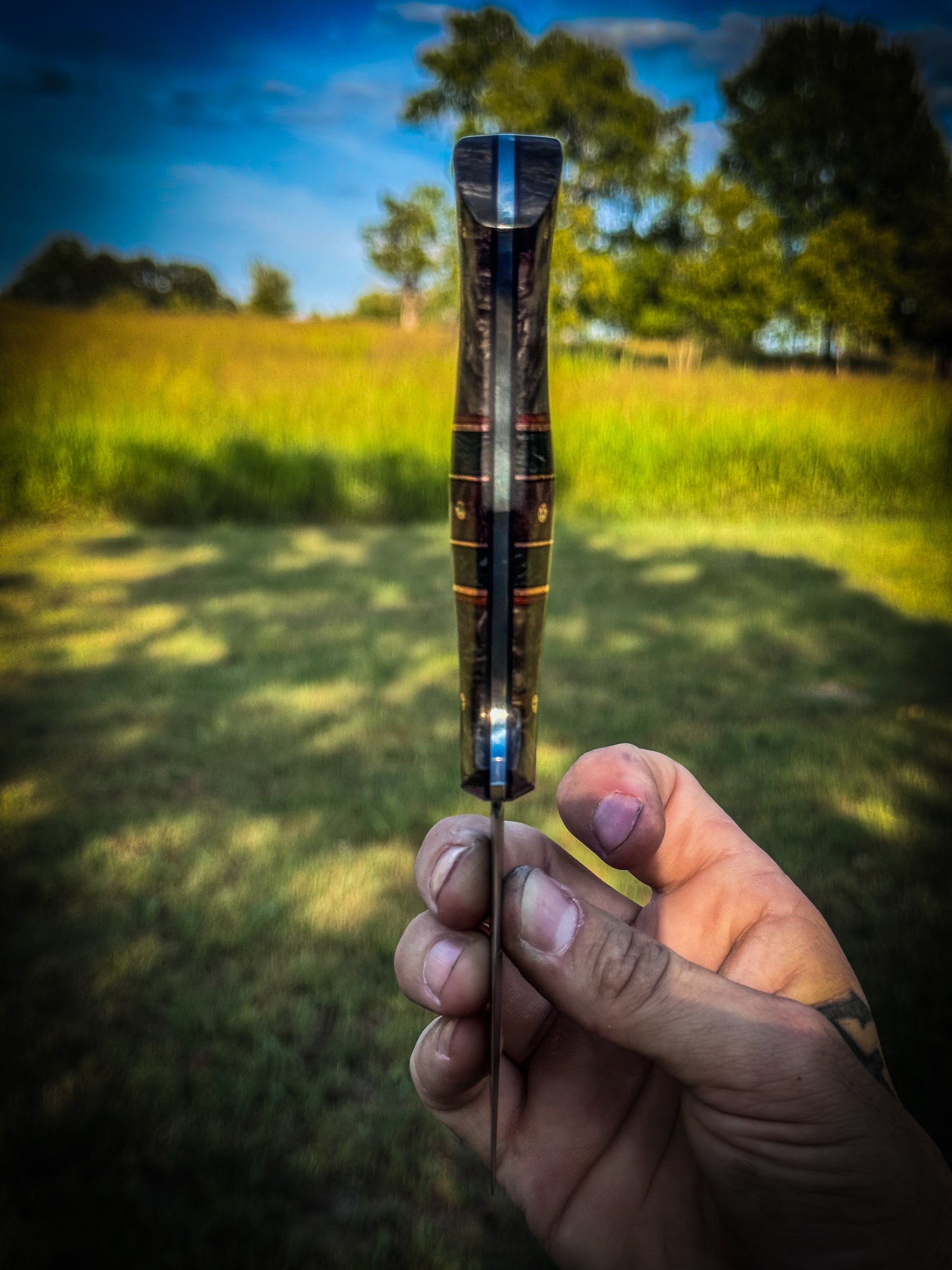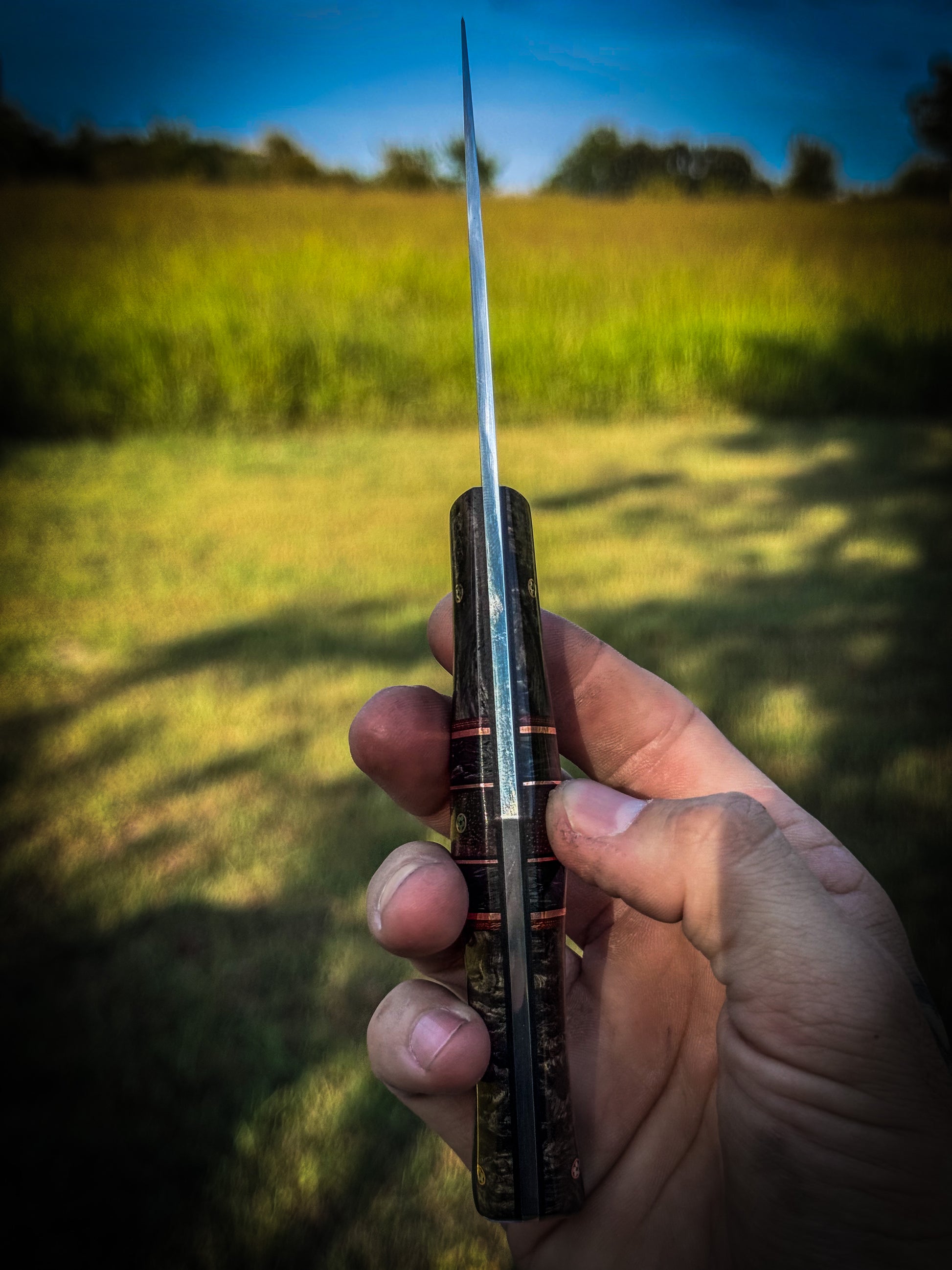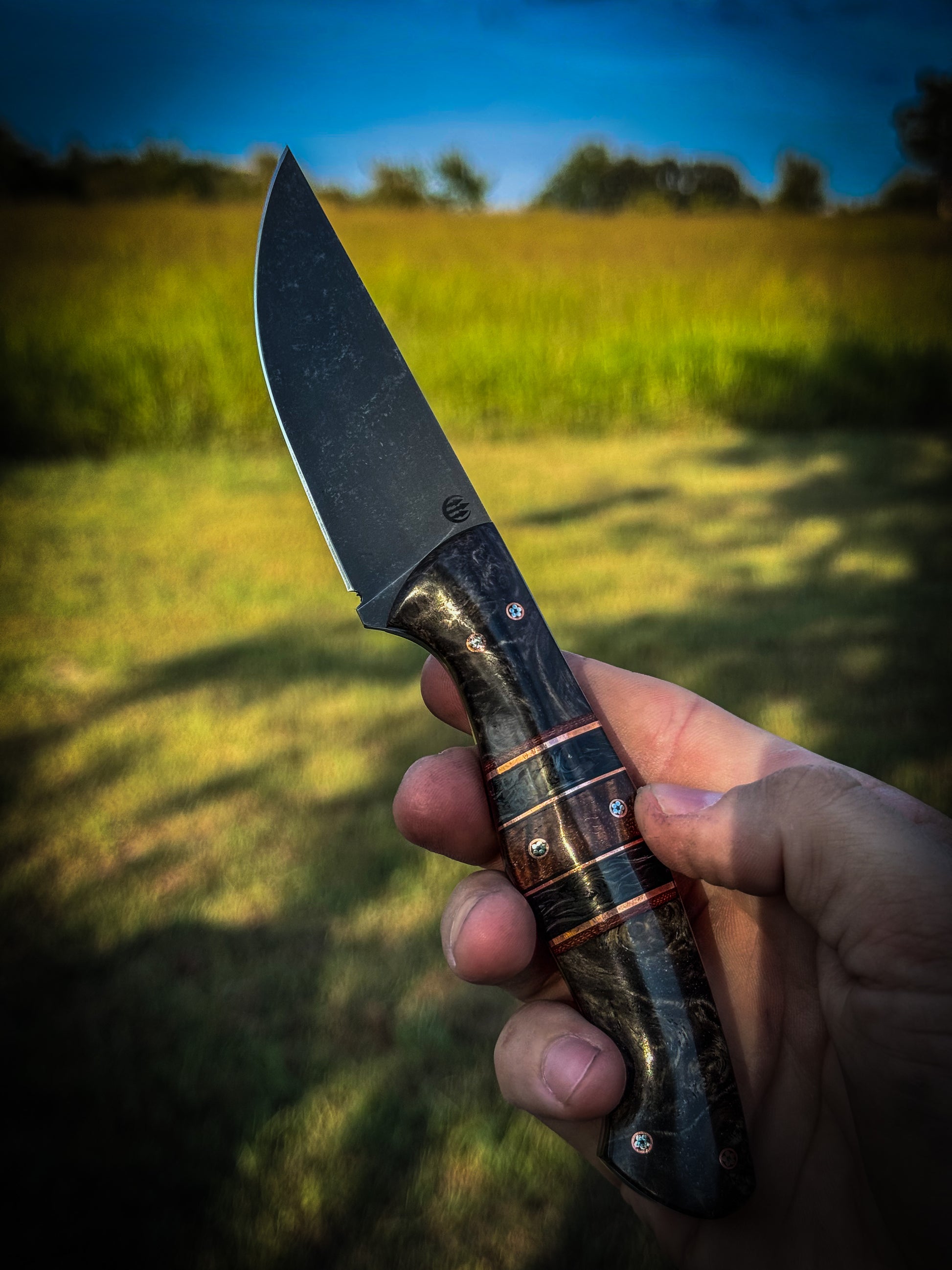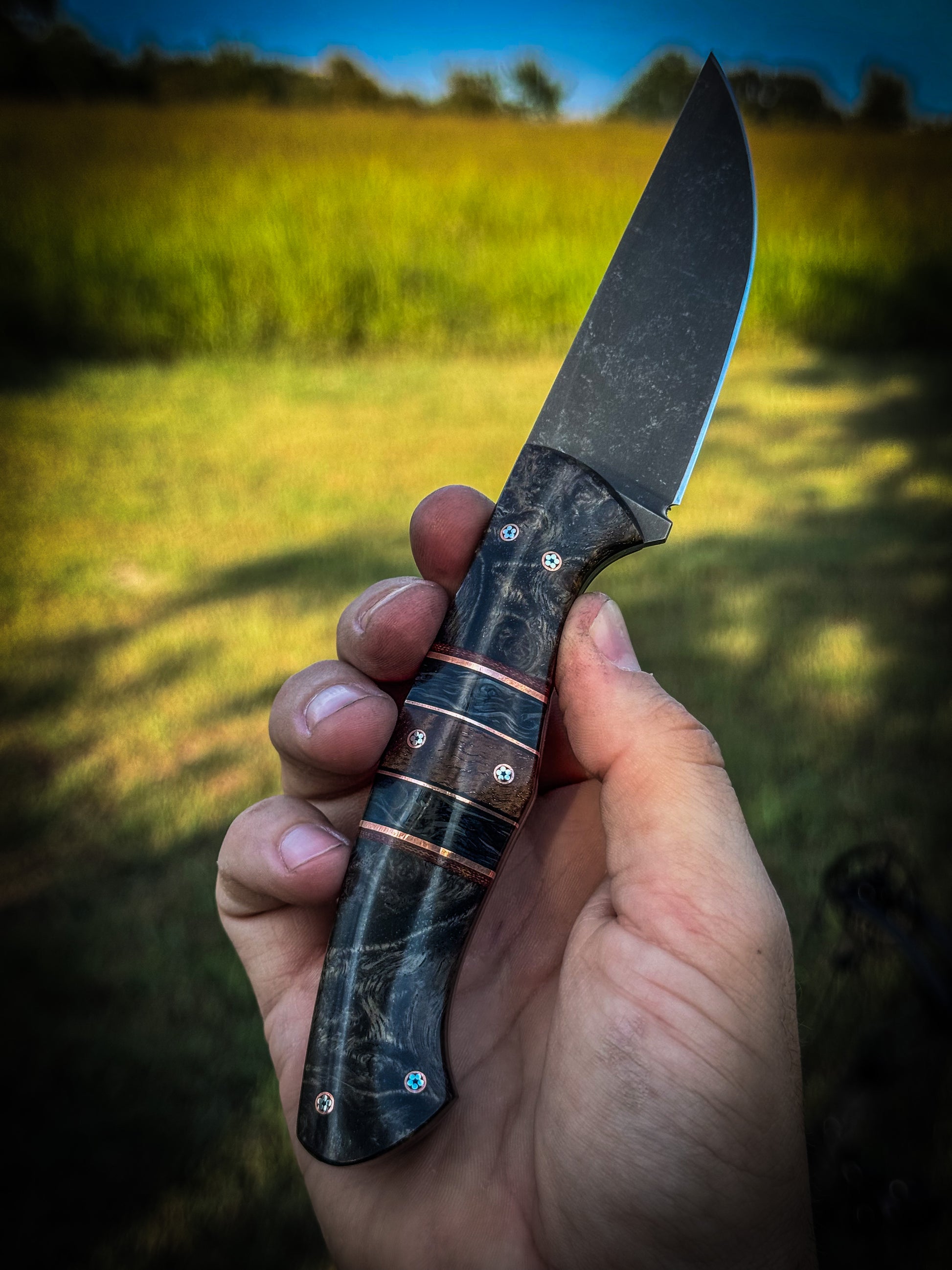 Handles: Black Dyed Amboyna burl/micarta/G10/copper/marbled carbon fiber/Curly Koa. Black G10 liners.